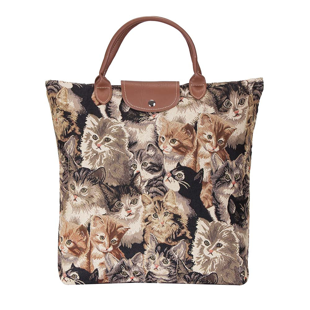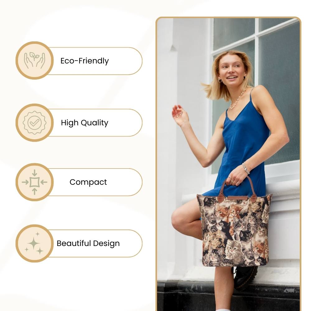 PRODUCT DESCRIPTION: Compact and eco-friendly, portable shopping bag. This tapestry collapsible grocery bag piece opens up to provide ample space for your shopping trips and folds away for easy storage in your handbag