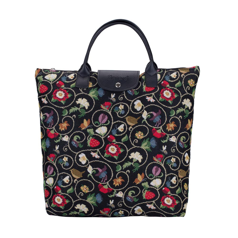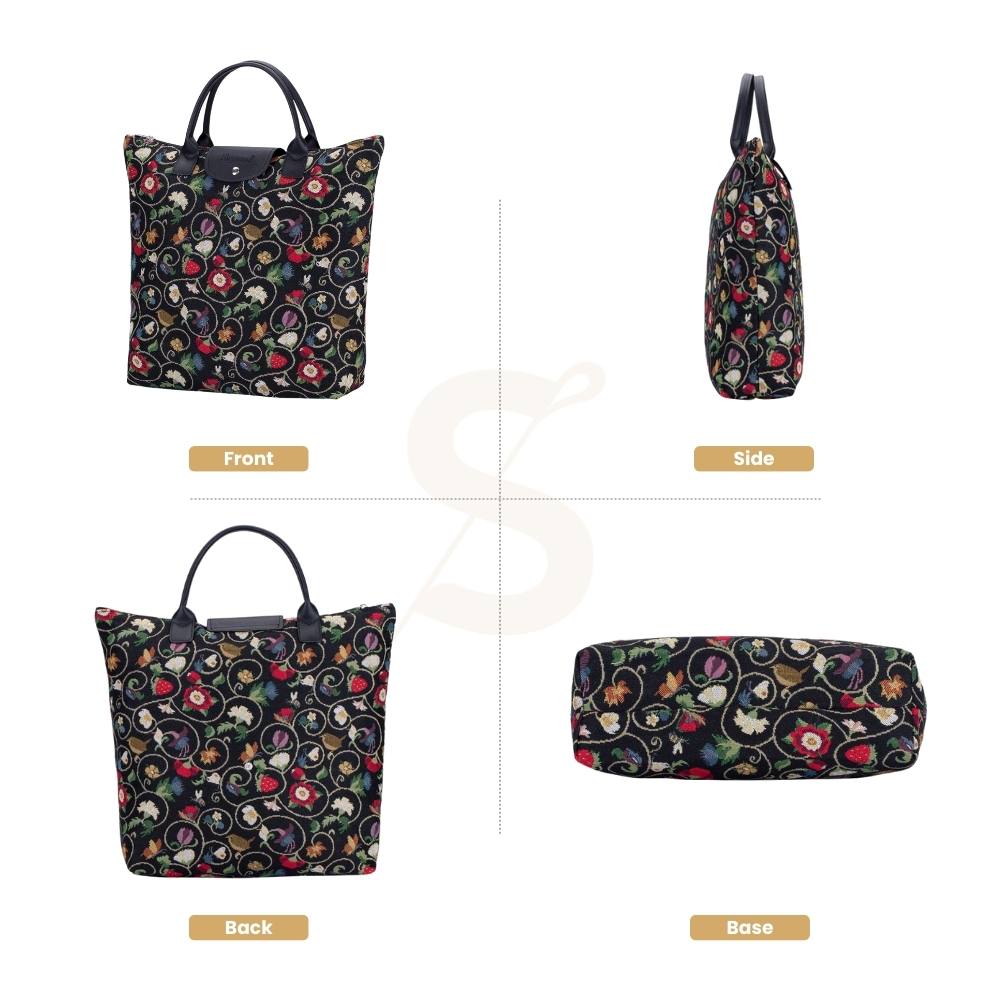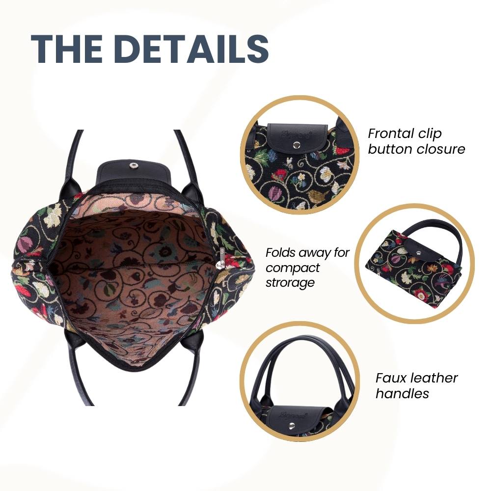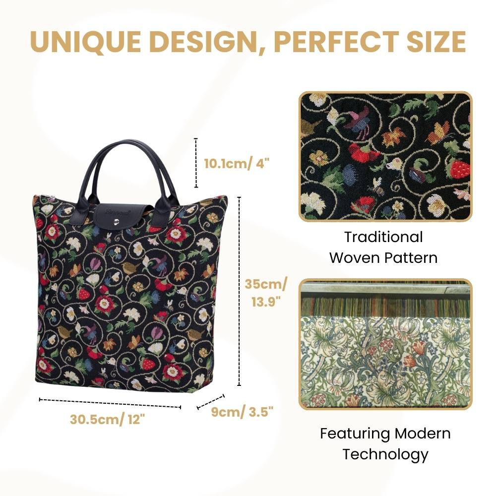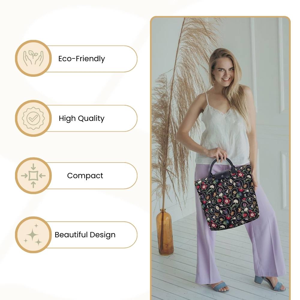 PRODUCT DESCRIPTION: Compact and eco-friendly, portable shopping bag. This tapestry collapsible grocery bag piece opens up to provide ample space for your shopping trips and folds away for easy storage in your handbag