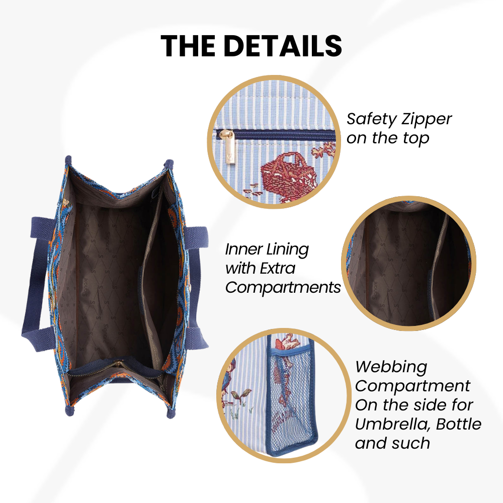 • Top of the bag is gusseted with the tapestry material and has zip fastening across the full width